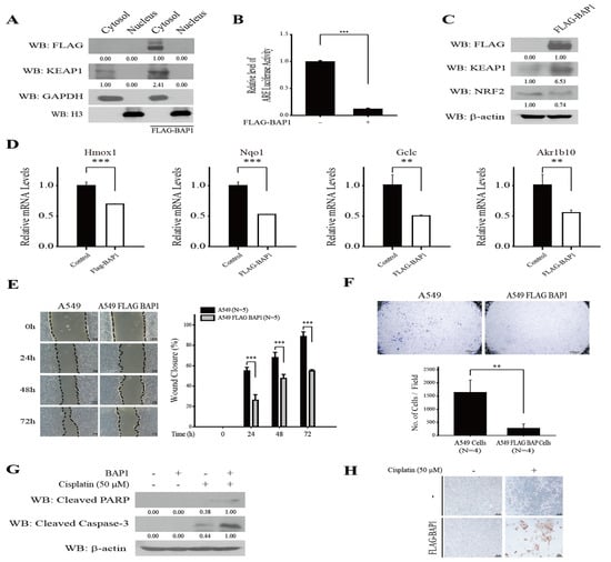 Aberrant NRF2 activity is frequently observed in human LUAD due to loss of function mutations in Keap1 [20]. Thus, we examined whether BAP1 can affect KEAP1 to modulate NRF2 target gene expression in human LUAD A549 cells. To address this issue, we generated stable A549-FLAG-BAP1 cells by lentiviral transduction and fractionated them into the nucleus and the cytosol. Our results show that transduced FLAG-BAP1 is mostly located in the cytosol (Figure 3A). We also observed that A549-FLAG-BAP1 cells exhibited a lower level of ARE-luciferase activity compared with A549 cells (Figure 3B). Transfection of pcDNA3-FLAG-BAP1 increased the level of KEAP1 and decreased the level of NRF2 in A549 cells (Figure 3C). Real-time RT-PCR analysis demonstrates that lentiviral transduction of FLAG-BAP1 significantly decreased the mRNA level of NRF2 target genes such as heme oxygenase-1 (Hmox1), NADPH:quinone oxidoreductase-1 (Nqo1), glutamate cysteine ligase catalytic subunit (Gclc), and aldo-keto reductase family 1 member B10 (Akr1b10) in A549 cells (Figure 3D). In addition, lentiviral transduction of FLAG-BAP1 suppressed the migration (Figure 3E) and the invasion (Figure 3F) of A549 cells, and potentiated cisplatin-induced apoptosis in A549 cells (Figure 3G,H). Together, these results illustrate that BAP1 lowers the level of NRF2 target genes by deubiquitinating and stabilizing KEAP1, thereby inhibiting the migration and invasion of A549 cells, and sensitizing A549 cells to cisplatin-induced apoptosis.