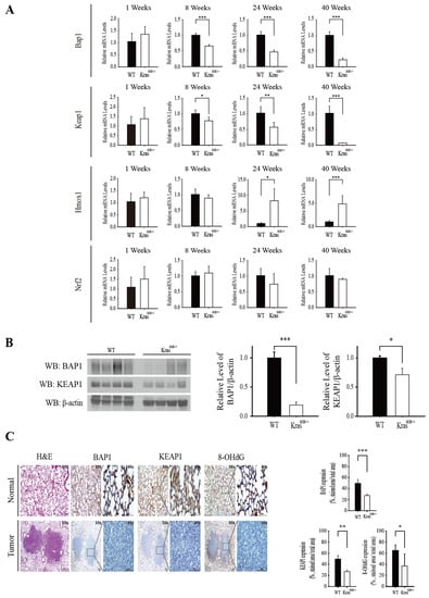 KEAP1 and BAP1 progressively decrease during lung tumor formation in Kras G12D/+ mice, contributing to NRF2 activation and the inhibition of oxidative stress. (A) The level of Bap1 and Keap1 mRNAs progressively decreases and that of Hmox1, a target gene of NRF2, progressively increases during lung tumor formation in Kras G12D/+ mouse. Wild-type mice (n = 16) and Kras G12D/+ mice (n = 16) were sacrificed after 1 week (n = 4 per group), 8 weeks (n = 4 per group), 24 weeks (n = 4 per group), and 40 weeks (n = 4 per group). The lung tissues were excised, and real-time RT-PCR was conducted. WT indicates wild-type. (B) The level of BAP1 and KEAP1 proteins are lower in the lung tissues of Kras G12D/+ mouse compared with those of wild-type littermates. The lung tissues of 40-week old wild-type and Kras G12D/+ mice were subjected to Western blot analysis against BAP1 and KEAP1 antibodies (left panel), and the relative level of BAP1 and KEAP1 in wild-type mice and Kras G12D/+ mice is plotted (right panel). WT indicates wild-type. (C) The levels of BAP1, KEAP1, and 8-OHdG are lower in the lung tumors of Kras G12D/+ mice, compared with normal lung tissues of wild-type (WT) littermates. The lung tissues of 40-week-old normal mice and Kras G12D/+ mice were subjected to H&E staining and immunohistochemistry against BAP1, KEAP1, and 8-OHdG. Representative figures are provided (left panel). The relative staining intensity of BAP1, KEAP1, and 8-OHdG in the normal lung tissue (n = 4) and lung tumor (n = 4) areas is plotted (right panel). * p < 0.05, ** p < 0.01, and *** p < 0.001.
