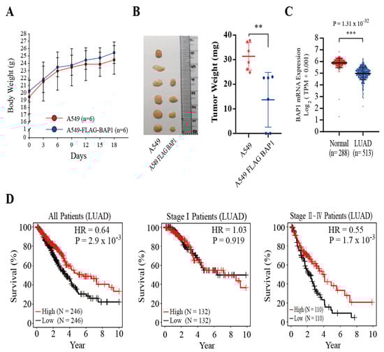 BAP1 suppresses the growth of A549 tumor xenografts and behaves as a tumor suppressor of LUAD. (A) The body weight of mice bearing A549 xenografts and A549-FLAG-BAP1 xenografts is indifferent. Athymic nude mice were injected with A549 cells (n = 6) and A549-FLAG-BAP1 cells (n = 6), and the body weights of mice were measured during the course of study. (B) Athymic mice bearing A549-FLAG-BAP1 xenografts produced fewer and smaller xenografts than mice bearing A549 xenografts. At sacrifice, the number (left panel) and the weight (right panel) of A549 and A549-FLAG-BAP1 xenografts were measured. (C) The expression of BAP1 mRNA levels is higher in normal lung samples than in LUAD samples. The mRNA levels (TPM) of BAP1 in normal and LUAD samples were obtained from the GTEx and the TCGA studies, respectively, in UCSC Xena (https://xena.ucsc.edu/, accessed on 25 March 2021). (D) The Kaplan–Meier curves show overall survival rate of LUAD patients at all stages (left panel), at stage I (middle panel), and at stages II–IV (right panel) stratified by BAP1-high and -low groups. ** p < 0.01, *** p < 0.001.