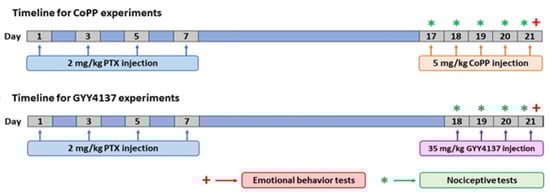 Schematic illustration of the design of the experiment, performed to determine whether the repetitive administration of CoPP (5 mg/kg) or GYY4137 (35 mg/kg) intraperitoneally injected over 5 and 4 consecutive days, respectively, can reverse the nociceptive responses caused by PTX and the associated emotional disorders. PTX: paclitaxel.