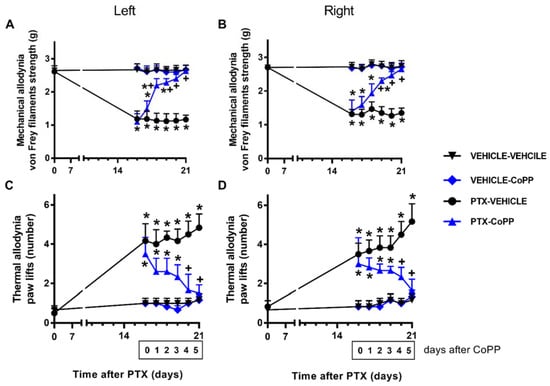 Effects of CoPP on PTX-induced mechanical and cold allodynia. Mechanical (A: left paws; B: right paws) and cold (C: left paws; D: right paws) antiallodynic effects produced by the repeated administration of 5 mg/kg of CoPP or vehicle for five days from days 17 to 21 after PTX injection. In all panels, for each day and treatment evaluated, * indicates significant differences vs. the vehicle–vehicle-treated animals and + vs. PTX–vehicle-treated animals (p < 0.05, one-way ANOVA followed by the SNK test). Results are shown as mean values ± SEM; n = 6 animals per experimental group.