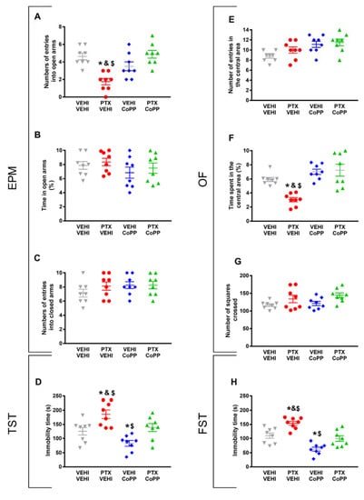 Regarding the anxiety-like behaviors, CoPP reversed both the decreased number of entries into the EPM’s open arms (p < 0.021, one-way ANOVA followed by the SNK test as compared with the vehicle–vehicle-treated mice; Figure 3A) and the decreased time spent in the central area of the OF in PTX-injected animals (p < 0.035, one-way ANOVA followed by the SNK test as compared with the vehicle–vehicle-treated mice; Figure 3F).