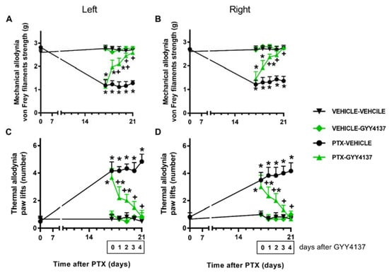 Effects of GYY4137 on PTX-induced nociception. Mechanical (A: left paws; B: right paws) and cold (C: left paws; D: right paws) antiallodynic effects produced by the repeated administration of 35 mg/kg of GYY4137 or vehicle for four days from days 18 to 21 after PTX injection. In all graphs, for each day and treatment evaluated, * indicates significant differences vs. the vehicle–vehicle-treated animals, and +, vs. the PTX–vehicle-treated animals (p < 0.05, one-way ANOVA followed by the SNK test). Results are shown as mean values ± SEM; n = 6 animals per experimental group.