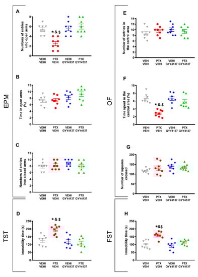 In the depressive-like behavior tests, GYY4137 stabilized the high time spent in immobility observed in PTX-injected mice, both in the TST (p < 0.005; one-way ANOVA followed by the SNK test comparing with vehicle–vehicle group; Figure 5D) and in the FST (p < 0.002; one-way ANOVA followed by SNK vs. the vehicle–vehicle-treated mice; Figure 5H).