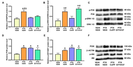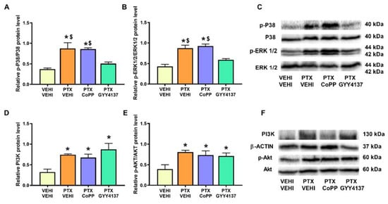 In PFC, PTX induced the phosphorylation of P38 (p < 0.010, one-way ANOVA followed by the SNK test in comparison to the vehicle–vehicle group; Figure 6A) and ERK 1/2 (p < 0.001, one-way ANOVA followed by the SNK test in contrast to the vehicle–vehicle group; Figure 6B). PTX also increased the PI3K (p < 0.016; one-way ANOVA followed by the SNK test compared with the vehicle–vehicle-treated mice; Figure 6D) and p-Akt levels (p < 0.0173, one-way ANOVA followed by SNK vs. the vehicle–vehicle group; Figure 6E). Our results show that both the CoPP and GYY4137 treatments normalized p-P38 levels and CoPP reversed the p-ERK 1/2 overexpression. Neither CoPP nor GYY4137 prevented the PTX-induced PI3K and p-Akt upregulation.