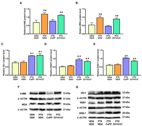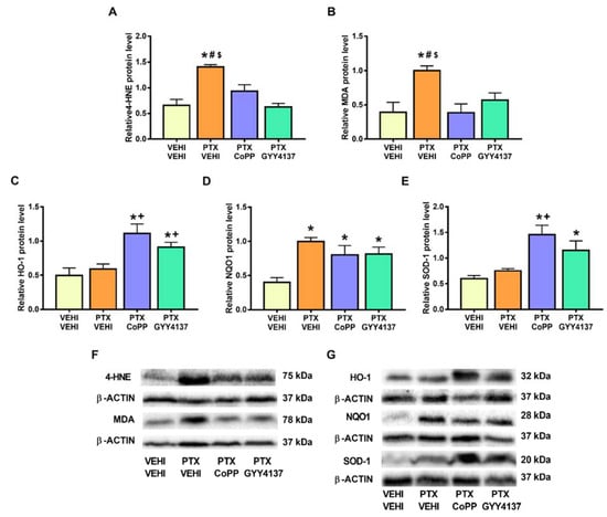 Effects of CoPP and GYY4137 on the levels of 4-HNE, MDA, HO-1, NQO1, and SOD1 in the PFC of PTX-injected mice. Graphs represent the levels of 4-HNE (A), MDA (B), HO-1 (C), NQO1 (D), and SOD-1 (E) in the PFC of PTX-injected animals treated with CoPP or GYY4137. The control group treated with VEHI–VEHI is also represented. Representative blots for 4-HNE and MDA (F) and for HO-1, NQO1, and SOD1 (G) are shown. All proteins are represented relative to β-actin levels. In all panels, * indicates significant differences vs. the VEHI–VEHI-treated mice; +, vs. animals treated with PTX–VEHI; and #, vs. the PTX–CoPP treated mice (p < 0.05, one-way ANOVA followed by the SNK post hoc test). Data are expressed as mean values ± SEM; n = 3 samples per group.