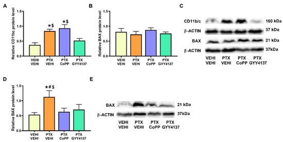 Regarding microglial activation, a significant increase in CD11b/c was observed in the PFC of PTX-injected mice (p < 0.007; one-way ANOVA followed by the SNK test as comparing with vehicle–vehicle group; Figure 10A). This increase was normalized by GYY4137 but not by CoPP treatment. The results for the apoptotic marker BAX revealed that, although no significant differences in its expression were observed in the PFC of PTX-injected mice (Figure 10B), an increase in its expression was detected in the DRG (p < 0.029; one-way ANOVA followed by the SNK test vs. the vehicle–vehicle-treated animals; Figure 10D). Both treatments reversed the BAX overexpression induced by PTX in the DRG.