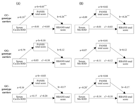 In addition to assessing the mediation role of psychotic symptoms on the relations between serum Cu/Zn-SOD/ Mn-SOD and cognition, we examined whether these mediation models would act differently with the rs3811655 genotype.For the C allele carriers, serum Cu/Zn-SOD exerted a significant indirect effect on the RANSS total score via psychotic symptoms (a × b = 0.05, 95% CI [−0.13, −0.01]) (Figure 2A). There were significant direct effects of Cu/Zn-SOD activity on psychotic symptoms (a = 0.19, p < 0.01) and psychotic symptoms on the RANSS total score (b = 0.26, p < 0.001), and no significant direct effects of Cu/Zn-SOD activity on cognition (c’ = 0.05, p > 0.05). Overall, these results indicated that among C allele carriers from the schizophrenia group, psychotic symptoms totally mediated the impacts of Cu/Zn-SOD activity on cognitive function.
