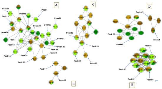 GNPS was applied for the visualization of the coffee metabolome obtained from the UHPLC-ESI–HRMS platform for authenticated green and roasted coffee seeds [20]. The graphical display aided in the annotation and dereplication of the metabolites obtained from the UHPLC-ESI–HRMS datasets and in the tentative identification of unknown peaks. The molecular networking (MN) that was created encompassed 145 connected nodes consisting of 11 clusters, the nodes of the network representing the compounds’ parent ions and the colors of the node representing the roasting and species attributes provided from the metadata file (Figure 1A–E).