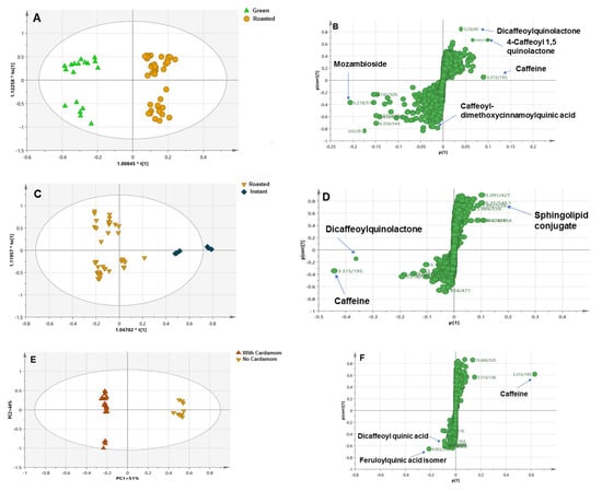 (A) OPLS-DA score plot based UPLC–MS analysis exploring green versus roasted coffee seeds. (B) OPLS-DA S-plot showing potential markers for green versus roasted coffee seeds. (C) OPLS-DA score plot for roasted versus instant samples. (D) OPLS-DA S-plot for roasted versus instant samples. (E) OPLS-DA score plot for plain versus blended coffee with cardamom samples. (F) OPLS-DA S-plot for plain versus blended coffee with cardamom samples. OPLS-DA S-plot models show covariance p [1] against the correlation p(cor) [1] for the variables of the discriminating components of the OPLS-DA models. Selected variables are highlighted in the S-plot and discussed in the text.