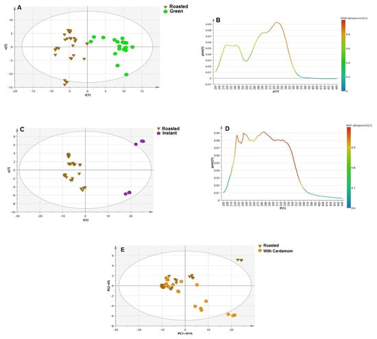 (A) OPLS-DA model for coffee samples (green versus roasted) based on UV–Vis analysis. (B) S-line based on roasting effect. (C) OPLS-DA for roasted versus instant samples. (D) S-line for instant and roasted samples. (E) PCA score plot model for plain roasted versus blended with cardamom samples. The S-plot shows the correlation (cor) and covariance p [1] between variables (wavelengths) and the predictive score of the discriminating component of OPLS-DA. The discriminant wavelengths in the important variables list are highlighted and discussed in the text.