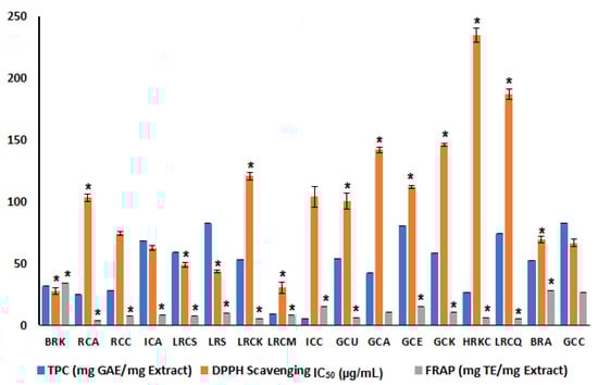 Total phenolic content (TPC) of the investigated coffee specimens with values expressed as mg gallic acid equivalent/g extract (mg GAE/g extract), DPPH (2,2-diphenyl-1-picrylhydrazyl) scavenging activity with values in IC50 ± SD (µg/mL), and ferric reducing antioxidant power (FRAP) with values expressed in mg Trolox equivalent per mg extract (mg TE/mg extract). Each bar represents mean ± SD (n = 3); the corresponding coffee specimen codes are listed in Table 1. *: Significant values compared to GCC specimen (p < 0.05).