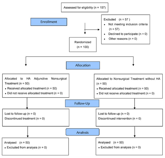 Study participants received code numbers, and a randomizing software was used to allocate patients to one of the two groups (non-surgical treatment only study group and non-surgical treatment with adjunctive hyaluronic acid (HA) treatment control group) (allocation ratio: 1:1, Research Randomizer Computer Software Version 4.0 from http://www.randomizer.org, accessed on the 9 October 2020) [18]. Participants were blinded as the hyaluronic acid was applied by an anesthetic syringe, which was also used in both study groups for anesthesia.