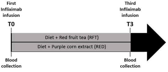 The experimental design of our study consisted of nutritional intervention in a heterogeneous group of 47 IBD patients (22 with CD and 25 with UC) at the start of the IFX infusion (Figure 1). The day of the first infusion is denominated time zero (T0) hereafter in the study. Patients were randomly subdivided into 2 groups: the diet + red fruit tea (RFT) or diet + purple corn extract (RED). The first group of patients received a normocaloric nutritional regime and a daily dose of commercial red fruit tea (total polyphenols content about 2 mg GAE/g DW (gallic acid equivalents per g of dry weight); total anthocyanin content of 0.5 mg cyanidin 3-glucoside (C3G) equivalents/g DW), the second group received the same normocaloric diet plus a daily dose of purple corn extract (with a flavor similar to red fruit tea) [31,33]. The RFT group included 27 patients (15 males and 12 females), 13 affected by CD and 14 by UC. The RED group included 20 patients (8 males and 12 females), 9 with CD and 11 with UC. Patients’ disease was monitored before each IFX infusion, and blood samples were collected before the first and the third anti-TNF infusion (T0 and T3, respectively), as shown in Figure 1.
