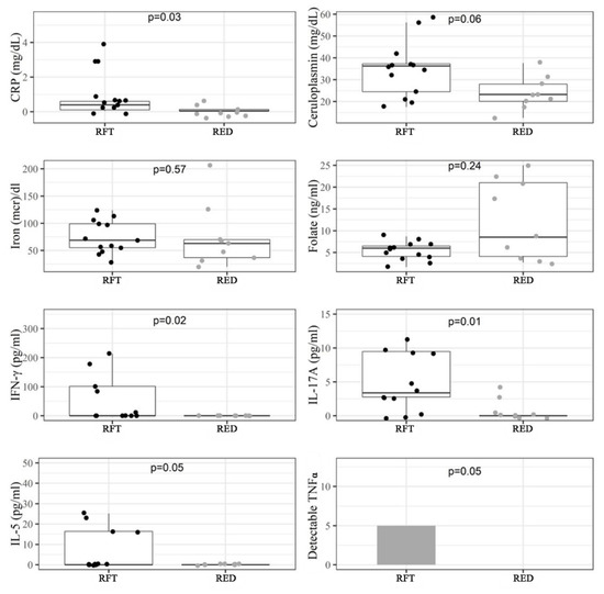 Serum analysis at T3 revealed differences between the RFT and RED groups of patients. Figure S2, Table 3 and Table S3 show an analysis of the diet with commercial red fruit tea (RFT) vs. the diet with purple corn extract (RED) group at T3. Despite IFX being administered to both groups, CRP, ceruloplasmin, and TNFα were significantly more reduced in the group receiving the RED. The increased folate circulating levels, following IFX administration, were not significantly different between the groups at T3 (p = 0.06), although an evident increase was observed in the RED group. Conversely, the iron concentration decreased, but not significantly, in the RED group as compared to the RFT group at T3.