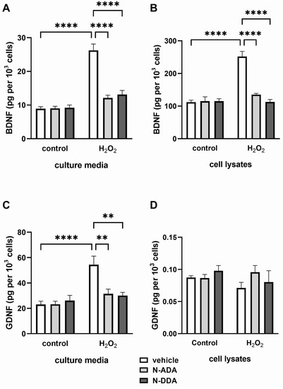 Thus, we have shown that 3 h after OS induction in the presence of N-ADA and N-DDA, the expression of BDNF and GDNF genes and their release from the cells is stimulated, although N-ADA had a significantly less pronounced effect. Analysis of BDNF and GDNF protein levels in neuronal cultures 24 h after H2O2 treatment but without the application of N-acyl dopamines, revealed increased BDNF levels in lysates and culture medium, while an increase of GDNF was observed only in the culture medium (Figure 3). When N-acyl dopamines are applied in the presence of H2O2, BDNF and GDNF levels remain at a level comparable to that in intact cells.