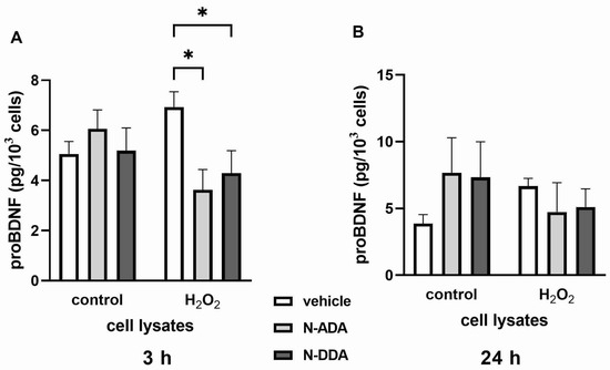 Since a recent report demonstrated that the applied here Human/Mouse BDNF DuoSet ELISA kit cross-reacts 100% with proBDNF [27] and therefore detects total BDNF (mature BDNF plus proBDNF), we additionally measured the effects of N-ADA and N-DDA on the levels of proBDNF under OS conditions using a specific proBDNF ELISA kit. In cell lysates, the predominant form of BDNF is mature BDNF (more than 97%). After 3 h but not 24 h of OS, both N-ADA and N-DDA caused a decrease in intracellular levels of proBDNF (Figure 4). At 3 h and 24 h of OS, the levels of proBDNF in the culture media were found to be below the detection limit of the ELISA kit (78.1 pg/mL, 2.4 pmol/l). Therefore, the detected changes in BDNF levels in the culture media can be attributed to the changes in the levels of mature BDNF.