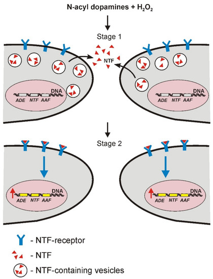 We assume that the action of N-acyl dopamines in the presence of H2O2 may consist of at least two possible stages. In the first stage, the action of N-acyl dopamines under the oxidative stress condition is associated with NTF (BDNF, GDNF, etc.) secretion by neurons into the culture medium. At the second stage, NTF binding to their corresponding receptors on the surface of neuronal cells takes place, followed by activation of these receptors causing intracellular signal transmission and induction of expression of the genes of corresponding NTF, antioxidant enzymes and anti-apoptotic factors. As a result, products of these genes promote survival and support normal functioning of neurons.
