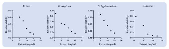 The effects of Citrus reticulata carotenoid extract on the relative bacterial viability are presented in Table 5 and Figure 1. The CCE extract depicted the maximum antimicrobial potential (IC50 = 4.22 mg/mL) against the Gram-positive strain Staphylococcus aureus (Table 5; Figure 1). Gram-negative strains demonstrated higher antimicrobial resistance against CCE extract compared to the Gram-positives. More specifically, Escherichia coli, Salmonella typhimurium, and Klebsiella oxytoca displayed a 50% inhibition in their relative viability using 8.63, 13.18, and 21.08 mg extract/mL, respectively (Table 5; Figure 1)