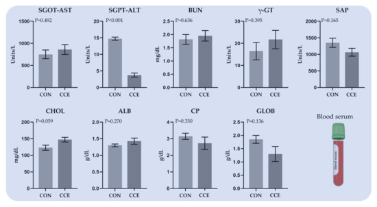 Blood serum from 16 broilers at 42 d of age in total (eight per treatment and two per replicate pen) was collected as already stated above to examine selected haematological and biochemical parameters. In detail, aspartate aminotransferase (SGOT-AST) (IU/L), alanine aminotransferase (SGPT-ALT) (IU/L), blood urea nitrogen (BUN) (mg/dL), γ-glutamyltransferase (γ-GT) (IU/L), alkaline phosphatase (IU/L), cholesterol (mg/dL), total proteins (g/dL), and fractions of albumins (g/dL) and globulins (g/dL) were assessed using an automatic ABX Pentra 400 analyzer (Horiba-ABX, Montpellier, France).