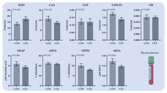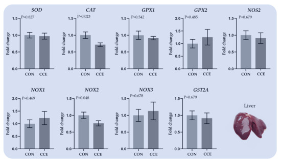 Numerous enzymes and cellular processes produce reactive oxygen species (ROS), as by-products of their catalytic function or from a dysfunctional variant of the enzyme. NADPH oxidases (NOX family) are the only enzymes whose principal role is to generate superoxide and consequently other ROS [57]. In our study, the relative transcript level of NOX2 was decreased in the liver of the CCE-fed birds, indicating a lower production of ROS. Although there is adequate information regarding the inhibitory effect of polyphenolic compounds towards NOX activity [58], there is a knowledge gap concerning the impact of carotenoids.