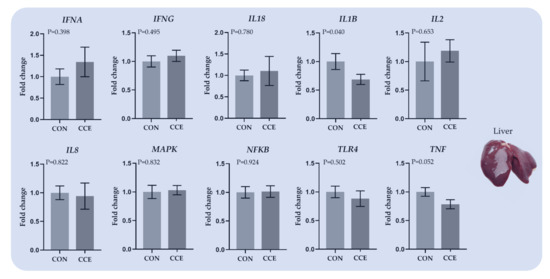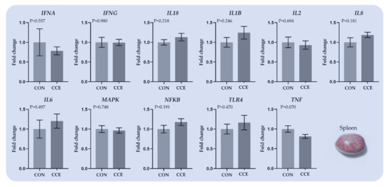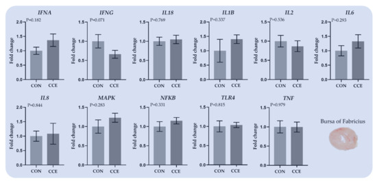 Various factors, such as disease, heat stress, and environmental conditions can threaten broilers’ immune-oxidative balance. Even though the principal regulatory factors of proinflammatory response, such as TLR4 and NFkB, were not affected, the pro-inflammatory cytokines IL1B and TNF were downregulated in the livers of the CCE-fed broilers while TNF was also suppressed in the spleens. Additionally, IFNG was downregulated in the bursa of Fabricius of the CCE-fed broilers as well. IL-1β and TNF-α are pro-inflammatory cytokines that regulate the inflammatory reactions and stimulate T cells and macrophages [59].