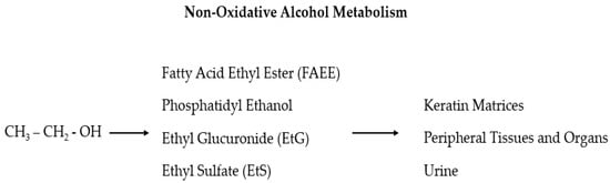 In the liver, ethanol is metabolized via oxidative and non-oxidative (less than 1%) ways. In the non-oxidative pathway, alcohol is finally processed as fatty acid ethyl ester (FAEE), phosphatidyl ethanol, ethyl glucuronide (EtG), and ethyl sulfate (EtS).