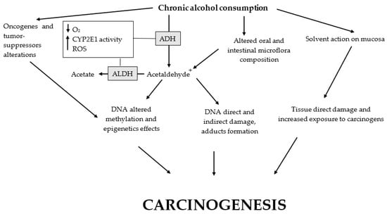 Main alcohol carcinogenic effects. Altered oral cavity and large intestine microflora, as well as polymorphisms of CYP2E1, ADH, and ALDH, promote the carcinogenic effects of alcohol. Ethanol chronic ingestion causes: (1) microflora changes with a reduction in the protective bacteria and prevalence of the flora related to increased production of acetaldehyde and its toxic effects; (2) the development of a hypoxic microenvironment with increased levels of ROS partially due to the activity of CYP2E1 (consequentially, ROS cause direct and indirect damage to macromolecules and DNA); (3) both increased oxidative stress and acetaldehyde metabolism may cause the formation of DNA adducts; (4) alcohol metabolism to acetaldehyde is related to altered DNA methylation with epigenetic effects; (5) somatic copy-number alterations of oncogenes and tumor suppressors may be triggered; and (6) a direct solvent action on the oral mucosae causing tissue damage and exposing the epithelial cells to carcinogens. ADH, alcohol dehydrogenase; ALDH, aldehyde dehydrogenase; CYP2E1, cytochrome P450 2E1; ROS, reactive oxygen species.