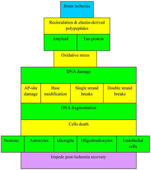 Recently, an intensively researched post-ischemic neuropathology has emerged in connection with genomic and proteomic development, which has transferred ischemia-reperfusion brain injury to a new level of neuropathological mechanisms, due to the presence of amyloid plaques and the development of neurofibrillary tangles, which further exacerbate oxidative stress in the brain in addition to the classic processes described so far after ischemia. The major amyloid plaque molecule are β-amyloid peptide 1-42 or 1-40, which is derived from proteolytic metabolism of the amyloid protein precursor. Additionally hyperphosphorylated tau protein is the major component of neurofibrillary tangles. Therefore, oxidative stress is a common and key factor in post-ischemic brain injury during recirculation. It consists of an increased generation of reactive oxygen species and reactive nitrogen species that damage various components of the cell such as DNA, lipids and proteins []. DNA oxidative injury is one of the deadliest end effects of increased oxidative stress post-ischemia [,]. Oxidative damage to DNA occurs within minutes in an ischemic brain [,], but oxidative breakdown can continue for up to six months after a stroke []. Problems with repairing damaged DNA result in the activation of various mechanisms that trigger the death of neuronal cells through apoptosis that threatens functional regeneration after stroke, with a high probability of developing full-blown dementia [].