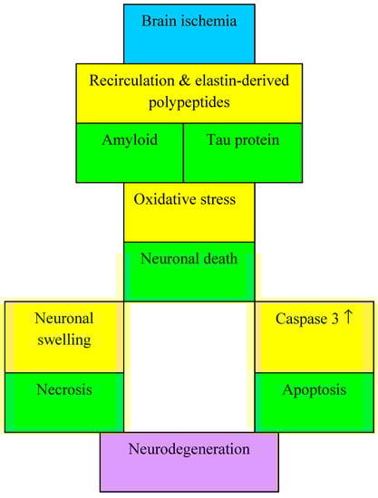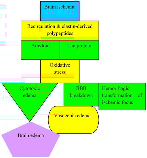 The key processes related to amyloid accumulation and its effects on ischemic brain injury are virtually unclear. The following is the amyloidogenic processing of the post-ischemic amyloid protein precursor that is associated with the production and deposition of amyloid in the brain following ischemia [,,]. In addition, it has been shown that patients with a history of ischemic stroke have an increase in elastin-derived polypeptides in the cerebrospinal fluid that contribute to the accumulation of amyloid in the extracellular space [,,,]. The accumulation of amyloid in the brain after ischemia [,] and its presence in the blood [,] indicate an important role of amyloid in the progression of ischemic brain injury with Alzheimer’s disease proteinopathy.