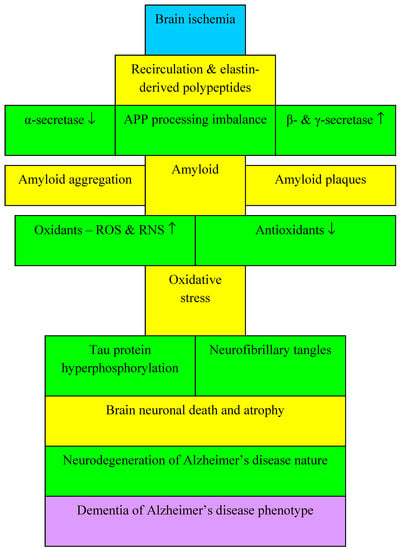Free radicals are physiological byproducts of cellular metabolism and are therefore inevitable. On the other hand, the imbalance between pro-oxidative and antioxidant cellular molecules leads to a vicious cycle where free radical oxidative stress causes oxidation of DNA, lipids and proteins in neurons and ultimately their death after ischemia. Oxidation can be considered a neuropathological marker in cerebral ischemia. It contributes to disease progression by increasing amyloid accumulation, tau protein hyperphosphorylation, and loss of neurons and synapses, leading to post-ischemic brain neurodegeneration in the form of Alzheimer’s disease proteinopathy (Figure 4). Additionally, several lines of evidence indicate that amyloid itself causes oxidative stress (Figure 4). Amyloid-triggered oxidative stress occurs in a bilayer in which the β-amyloid peptide is inserted as oligomer and serves as a source of reactive oxygen species [].