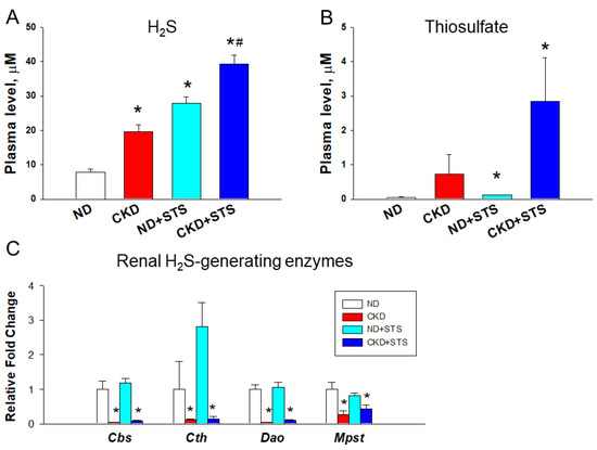 Effects of sodium thiosulfate (STS) on the (A) plasma H2S level, (B) plasma thiosulfate level, and (C) renal mRNA expression of H2S-generating enzymes. All the results represent the mean ± the standard errors of eight animals in each group. Data are analyzed by one-way ANOVA followed by Tukey’s post hoc test. * p < 0.05 versus control g; * p < 0.05 vs. ND; # p < 0.05 CKD.