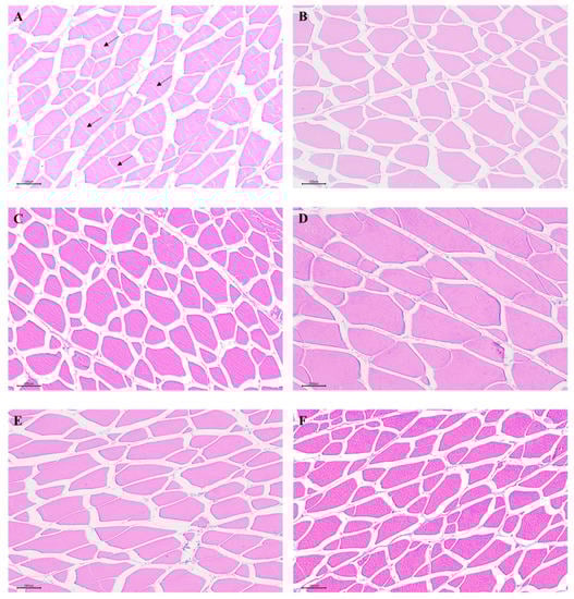 The histology of on-growing grass carp muscle (H&E 100×): (A) The vitamin A-deficient group. Arrowhead showed the rupture in muscle fiber. (B) The group with vitamin A at 606.8 IU/kg. (C) The group with vitamin A at 1209 IU/kg. (D) The group with vitamin A at 1798 IU/kg. (E) The group with vitamin A at 2805 IU/kg. (F) The group with vitamin A at 3796 IU/kg.