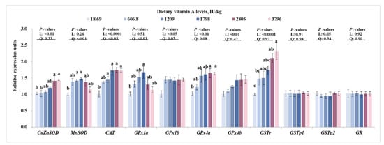 Effects of dietary vitamin A on relative mRNA levels of antioxidant enzymes genes in muscle of on-growing grass carp. Data are means ± SEM of three replicate groups, two fish for each replicate (n = 3). a, b, c within a column, means without a common lowercase superscript differ (p < 0.05). p-values underlined with a solid line indicate a linear and quadratic response to dietary vitamin A levels. SEM = standard error of the mean; L = linear; Q = quadratic; CuZnSOD = copper/zinc superoxide dismutase; MnSOD = manganese superoxide dismutase; CAT = catalase; GPx1a = glutathione peroxidase 1a; GPx1b = glutathione peroxidase 1b; GPx4a = glutathione peroxidase 4a; GPx4b = glutathione peroxidase 4b; GSTr = glutathione-S-transferase r; GSTp1 = glutathione-S-transferase p1; GSTp2 = glutathione-S-transferase p2; GR = glutathione reductase.