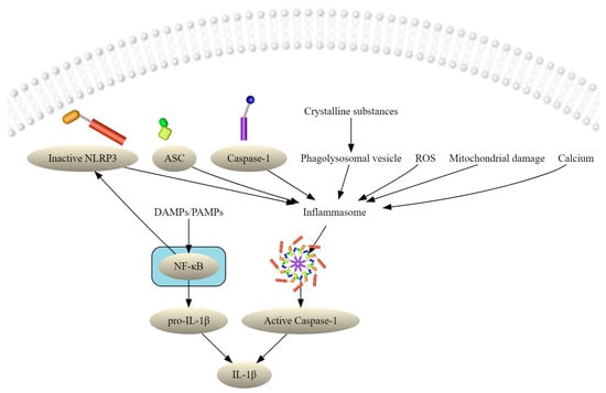 In response to several bacterial ligands acting as PAMPs, e.g., lipopolysaccharide (LPS) [,], peptidoglycan [], bacterial and viral RNA [,], and flagellin [], NLRP3 regulates the maturation and secretion of proinflammatory cytokines, like IL-1β [] via proCASP1. Furthermore, an upregulation of the NLRP3 inflammasome complex leads to an increase in the genesis of IL-1β [,] and IL-18 [,,].