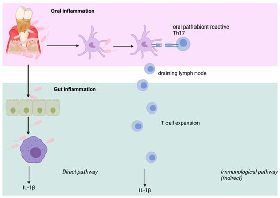 Schematic illustration of immunological pathways of the oral microbiome. There is a direct and an indirect immunological pathway for dysregulations of the oral microbiome effecting the colonic microbiome.