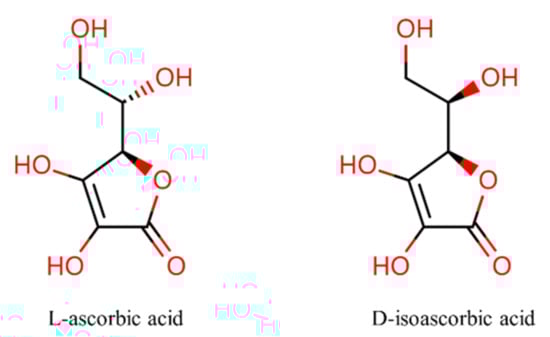 Ascorbic acid (L-enantiomer, Figure 1), commonly known as vitamin C, is composed of six carbons and related to the C6 sugars. It is the aldono-1,4-lactone of a hexonic acid with an enediol group on carbons 2 and 3. As an essential micronutrient, ascorbic acid plays a vital role in maintaining normal metabolic processes and homeostasis within the human body. Although D-isoascorbic acid is the stereoisomer of ascorbic acid (Figure 1), such analogues hardly express the activity of ascorbic acid. Mammalian cells cannot synthesize ascorbic acid de novo due to the lack of L-gulono-1,4 lactone oxidase, which is an essential enzyme for the production of ascorbic acid []. Vegetables and fruits serve as natural sources of vitamin C intake, but only a limited number of plants are rich in vitamin C. Nowadays, ascorbic acid is industrially produced from D-glucose, and the procedure involves several complex chemical and biotechnological stages [].