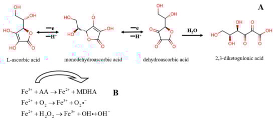 The by-products of normal cell metabolism are reactive oxygen species (ROS), including superoxide radicals (O2·−), singlet oxygen (1O2), hydrogen peroxide (H2O2) and highly reactive hydroxyl radicals (OH·). The adverse effect of ROS is that it can initiate a cascade of radicals, producing hydroxyl free radicals and other destructive species. These further induce protein and DNA damage, lipid peroxidation and finally lead to cell apoptosis []. The antioxidant defense system cannot fully eliminate the toxic ROS accumulated in the cells, that is, the so-called “oxidative stress” occurs []. In addition to enzymatic reactions, ROS can also be eliminated through non-enzymatic means such as antioxidants. Ascorbic acid is a free radical and other oxygen species scavenger, which can protect cells from oxidative damage caused by ROS. Antiradical capability commonly reflects the antioxidant ability, and ascorbic acid in foodstuff and bio-systems acts as antioxidant. As the most effective and natural antioxidant with the least side effects, ascorbic acid can inhibit various diseases caused by oxidative stress in the body, such as cancer, cardiovascular disease, aging and cataracts []. Studies have shown that the mortality from these diseases is inversely related to plasma concentration of ascorbic acid []. Ascorbic acid and its derivatives can reduce the level of lipid peroxidation in vivo due to aging []. In the absence of transition metals, ascorbic acid can reduce the frequency of mutations induced by H2O2 in human cells []. Compared with other polyphenols or flavonoid antioxidants, ascorbic acid terminates the free radical chain reaction through disproportionation reaction, and the reaction products such as DHA and 2,3-diketogulonic acid (Figure 2A) are non-damaging and non-radical products []. Another manifestation of antioxidant property is that ascorbic acid can form relatively stable ascorbic acid free radicals to donate single electrons []. As reported, antioxidants can also repair tryptophan free radicals produced by the one-electron oxidation of free tryptophan in lysozyme to maintain protein integrity [].