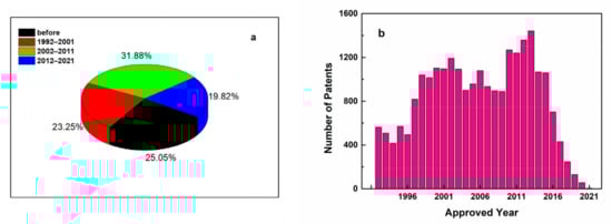 The proportion of patents related to ascorbic acid search terms before 2021 (a) and the number of ascorbic acid patents in each of the past 30 years (b).