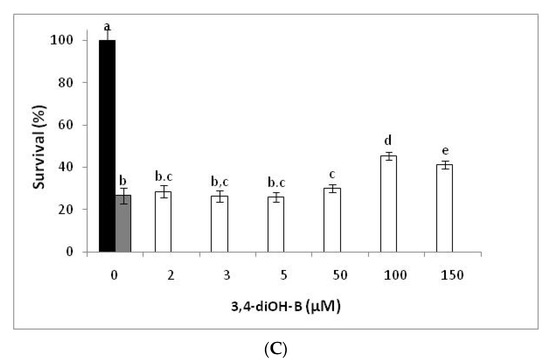 Effect of the tested phenolic compounds on survival rates of S. cerevisiae BY4741 cells treated with H2O2 (5 mM). Black bar means untreated cells, gray bar means cells treated only with H2O2, and white bars mean cells treated with H2O2 + 2,3-diOH-BA (A), 3,4-diOH-BA (B), and 3,4-diOH-B (C). Data represent the mean values ± SD of at least three independent experiments. Different lowercase letters above the bars indicate a statistically significant difference at p < 0.05.