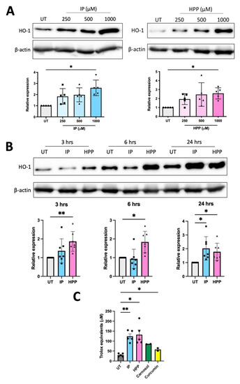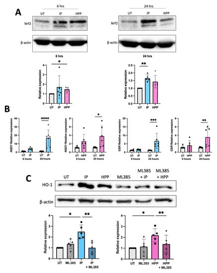 3.2. HPP and IP Induce HO-1 through Nrf2 Activation