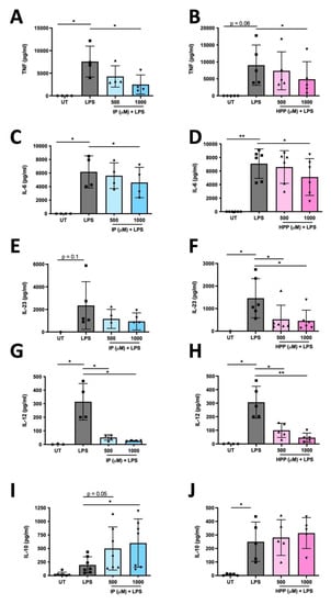 3.3. HPP and IP Reduce the Production of Pro-Inflammatory Cytokines in LPS-Stimulated Human DC