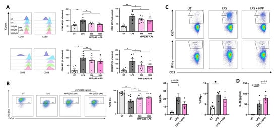 HPP treatment reduces DC maturation and subsequent CD4+ T cell activation. Primary human DC were left untreated (UT) or incubated with HPP (500–1000 μM) for 6 h prior to stimulation with LPS (100 ng/mL) for 24 h. (A) Cells were stained for CD40, CD80, CD86, and CD83 and analysed by flow cytometry. Histograms showing the expression of maturation markers for HPP-treated, LPS-stimulated DC compared to unstimulated cells or LPS stimulation alone from one representative experiment. Pooled data showing the mean (±SEM) MFI for each marker expressed as a percentage of control (LPS stimulation alone) from six to seven healthy donors. (B) DC were incubated with FITC-conjugated DQ-Ovalbumin (DQ-Ova; 500 ng/mL) for 20 min and were immediately acquired by flow cytometry. Dot plots depicting DQ-Ova uptake from one representative experiment. Pooled data showing the mean (±SEM) DQ-Ova uptake as a percentage of total cells from nine healthy donors. (C) DC were pre-treated with HPP prior to stimulation with LPS, and subsequently cultured with CD4+ T cells for five days. Dot plots depicting ki67 expression (as a measure of proliferation) and IFNγ expression from one representative experiment. Pooled data showing the mean (±SEM) of ki67+ and IFNγ+ cells as a percentage of CD3+CD8− cells from four healthy donors. (D) Cell supernatants were assessed for IL-10 secretion by ELISA. Pooled data depict mean (±SEM) cytokine concentrations for four healthy donors (means of three technical replicates per donor). Repeated measures one-way ANOVA, with Dunnett’s multiple comparisons post hoc test, was used to determine statistical significance by comparing means of treatment groups against the mean of the control group (*** p < 0.001, ** p < 0.01, * p < 0.05).