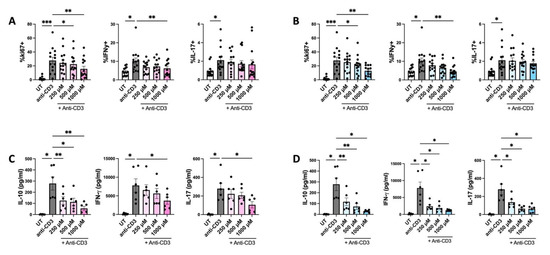 This study received ethical approval from St Vincent’s University Hospital Ethics and Medical Research Committee to take blood samples from consenting patients (N = 14) attending a specialist outpatient clinic for inflammatory bowel disease (IBD). PBMC were isolated as above and frozen at −80 °C. PBMC were thawed and treated with either IP or HPP (250–1000 μM) for 6 h prior to stimulation with anti-CD3 (1 μg/mL) for 12 h. The media was then removed and replaced with fresh media to circumvent issues that occur as the compounds become fluorescent after incubations over long periods of time, and cells were maintained in the presence of anti-CD3 for a further four days. The supernatants were then removed for analysis of IL-10, IFNγ, and IL-17A by ELISA. PBMC were restimulated in complete IMDM medium in the presence of 50 ng/mL PMA, 500 ng/mL ionomycin, and 5 µg/mL brefeldin A for 4 h. The cells were washed in PBS and stained for viability (Zombie NIRTM Fixable Viability kit) for 15 min at room temperature. The cells were then washed in PBS and stained with fluorochrome-conjugated antibodies for surface markers CD3 and CD8 for 15 min at room temperature. After this, the cells were then washed and fixed (FIX & PERM™ Cell Permeabilization Kit) for 15 min at room temperature. Finally, the cells were washed and stained for intracellular markers Ki67, IFNγ and IL-17 in permeabilization buffer for 15 min at room temperature. The cells were then washed and acquired on a BD LSRFortessa flow cytometer. The analysis was performed with FlowJo v.10. All antibodies used in this experiment were chosen carefully to avoid channels which still had some fluorescence issues, despite the steps taken to overcome this.