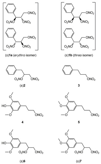 In a previous work [22] we described the synthesis and the in vitro vasodilator profile of a new series of compounds, in which the phenyl group was introduced into the molecule of GTN; analogues obtained formally by elimination of one or two nitrooxy groups were also synthesized and characterized. On the basis of the results obtained, in this paper we report the ex vivo characterization of the tolerance profile of the nitrooxyphenylalkyl derivatives 1-3 (Figure 1). In the light of the oxidative stress hypothesis of nitrate tolerance, here we report also the ex vivo characterization of the tolerance profile of new organic nitrates 4 and 6 with antioxidant properties, formally obtained by joining an antioxidant phenol moiety with a nitrooxyalkyl chain. The synthesis and the antioxidant activity of these multitarget drugs were described in previous works [23,24]. The in vitro vasodilating activity of new antioxidant nitrates and their metabolic transformations are also reported here. Compounds 5 and 7 were expressly synthesized; these molecules, devoid of antioxidant activity, were taken as references, together with GTN.