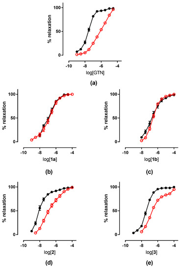 Concentration-response curves of GTN and nitrooxyphenylalkyl derivatives in control experiments (black ●) and tolerant vessels (red ○). (a) GTN; (b) compound 1a; (c) compound 1b; (d) compound 2; (e) compound 3.