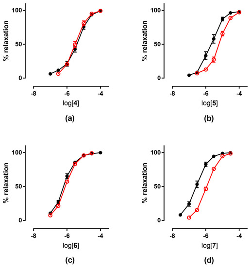 Concentration-response curves in control experiments (black ●) and tolerant vessels (red ○) of: (a) compound 4; (b) compound 5; (c) compound 6; (d) compound 7.