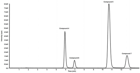 Chromatographic profile in total ion current of the ion precursor–ion products transitions reported in Table 1 of a standard solution of compounds 4, 5, 6 and 7 at the concentration of 10 µg/mL.