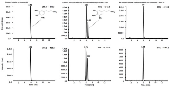 Figure 6 shows the chromatogram of a standard solution of compounds 4, 5, 6 and 7 reported as total ion current (TIC). After two hours’ incubation of compounds 5 and 7 in the rat liver microsomal fraction, four peaks appeared in tandem mass chromatograms relative to the precursor–product ions transitions selected to detect the main metabolites, compounds 4 and 6, respectively. Two of these signals are relative to compounds 4 and 6 while the other two peaks are possibly attributed to their structural isomers, namely compounds 4-iso and 6-iso, carrying the demethylated hydroxyl group in the meta-position with respect to the propyl-nitrate group. The latter peaks were not present in the chromatogram of the rat liver microsomal fraction incubated with compounds 4 or 6, confirming that they are metabolic products of compounds 5 and 7, respectively (Figure 7 and Figure 8).