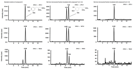 Further and more sensitive experiments were conducted by selecting the two most probable precursor–product ion SRM transitions, namely m/z 274→228 (loss of NO2) and m/z 274→167 (losses from the side chain), likewise fragmentation is observed in compound 6. Figure 11A reports the comparison between the two SRM transitions obtained from the rat liver microsomal fraction, before the incubation with compound 6 and after two hours, respectively. From this experiment of enhanced sensitivity, a high chromatographic peak is evident at the retention time of 2.61 min only in the profile collected after two hours’ incubation. The same experiment was executed on the rat liver microsomal fraction incubated with compound 7, to confirm that m/z 274.0 corresponds to a metabolite of compound 6, not produced from compound 7 (Figure 11B).